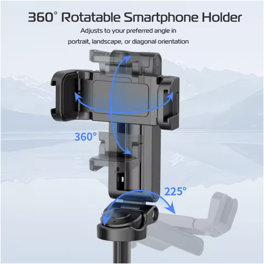 ăComplete Control over AnglesăThe smartphone holder rotates 360°, enabling you to adjust your phone's orientation to portrait, landscape, or diagonal positions effortlessly.This grants you full control over the composition of your shots.